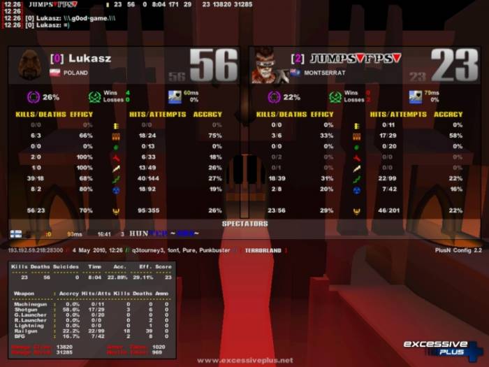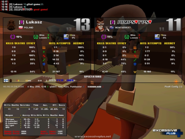 Поиграл я с ультимой 1-1 ранк. Ну что сказать, вполне реально снести их на фв. Нужно юзать мозг. А так ничего особенног оя не увидел. На дм7 одного фрага мне не хватало, я полез вперед за 10 сек, и даже с рельсы попал, но он сука был отожран и меня убил ( неповезло), но тем не менее. А турней3, там оп по спаунам епашил все время, даже тяжело было отойти от респа, летят бфг, рокеты и рельсы. Все равно ГГ. На дм7 я показал хорошую игру, при учете того, что заепали трястить руки на ранкинге.